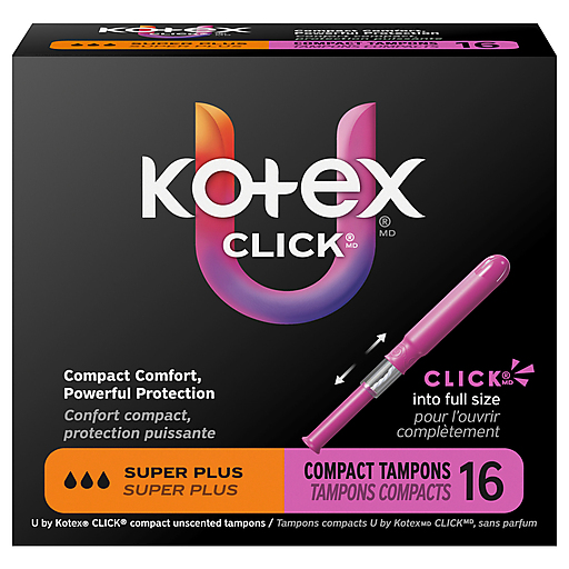 Get up to 100% leak-free protection and stay confident throughout your day with U by Kotex Click Compact Tampons! Made without fragrance, Click tampons for women are designed for your comfort and have a smooth tip for easy and comfortable insertion. Each tampon features ComfortFlex grooves that move with y ou for outstanding comfort. Try U by Kotex Click Tampons and see why the #1 compact tampon* is chosen by women every 1.9 seconds. Pocket-sized and small enough to carry in your purse or pocket, these tampons go from compact to a full-size tampon in one easy step giving you comfortably compact, powerful protection. Pull the lower half of the tampon and when it locks in place, it’s ready to go! U by Kotex Click Compact Tampons are available in regular, super and super plus absorbencies. For backup period protection, try U by Kotex Barely There Pantiliners. U by Kotex feminine products are FSA/HSA/HRA-eligible in the U.S. Packaging may vary from images shown.*Based on sales data**Among those with a preference